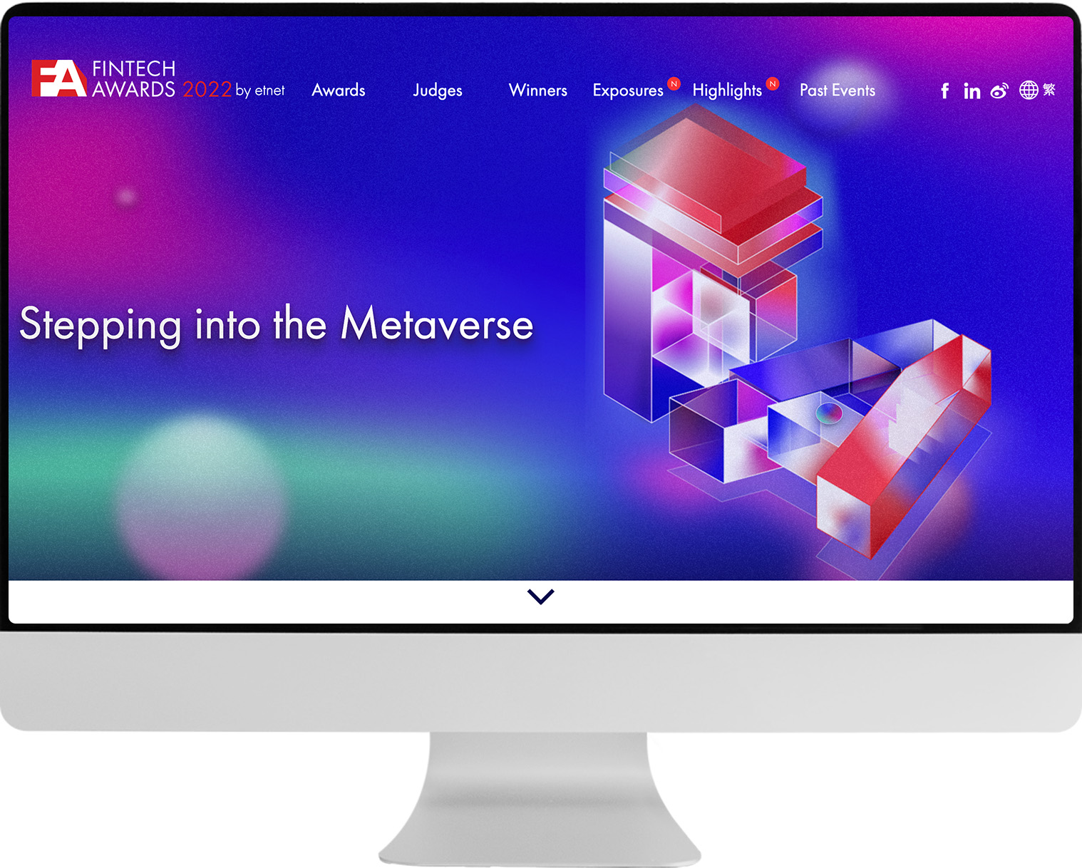The theme for this event "Stepping into the Metaverse", inspired me to create an electronic universe using a combination of deep blue, fluorescent pink, and fluorescent green colors.The sphere takes center stage in this design, symbolizing the user's journey through the Fintech Award's universe. The sphere does not have a specific position or color, representing the user's freedom and versatility within the universe.